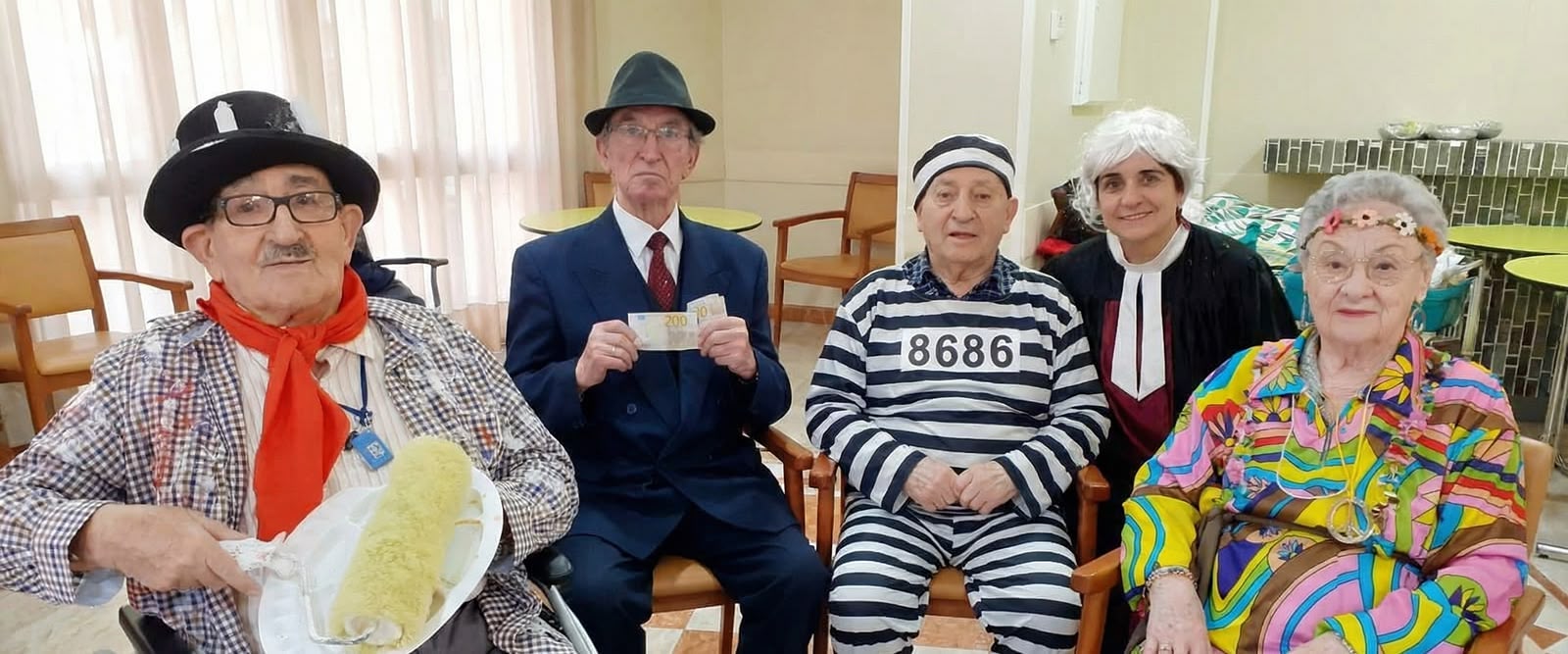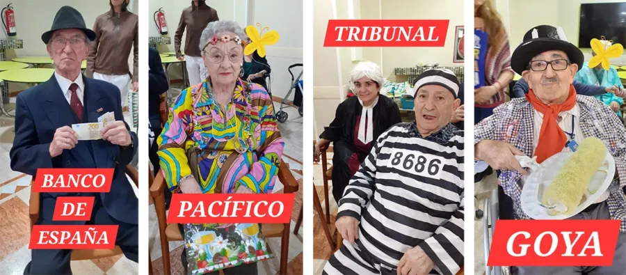 El día de la celebración, el equipo de Animación Sociocultural dio forma a una original fiesta de disfraces temática en la que cada participante representó una parada de metro. Desde empresarios en “Banco de España” hasta jueces y presos en “Tribunal”, la creatividad llenó cada rincón del centro. La sorpresa fue aún mayor cuando algunos familiares se sumaron a la propuesta y participaron activamente en este juego simbólico, compartiendo el Carnaval en una residencia de mayores con sus seres queridos.